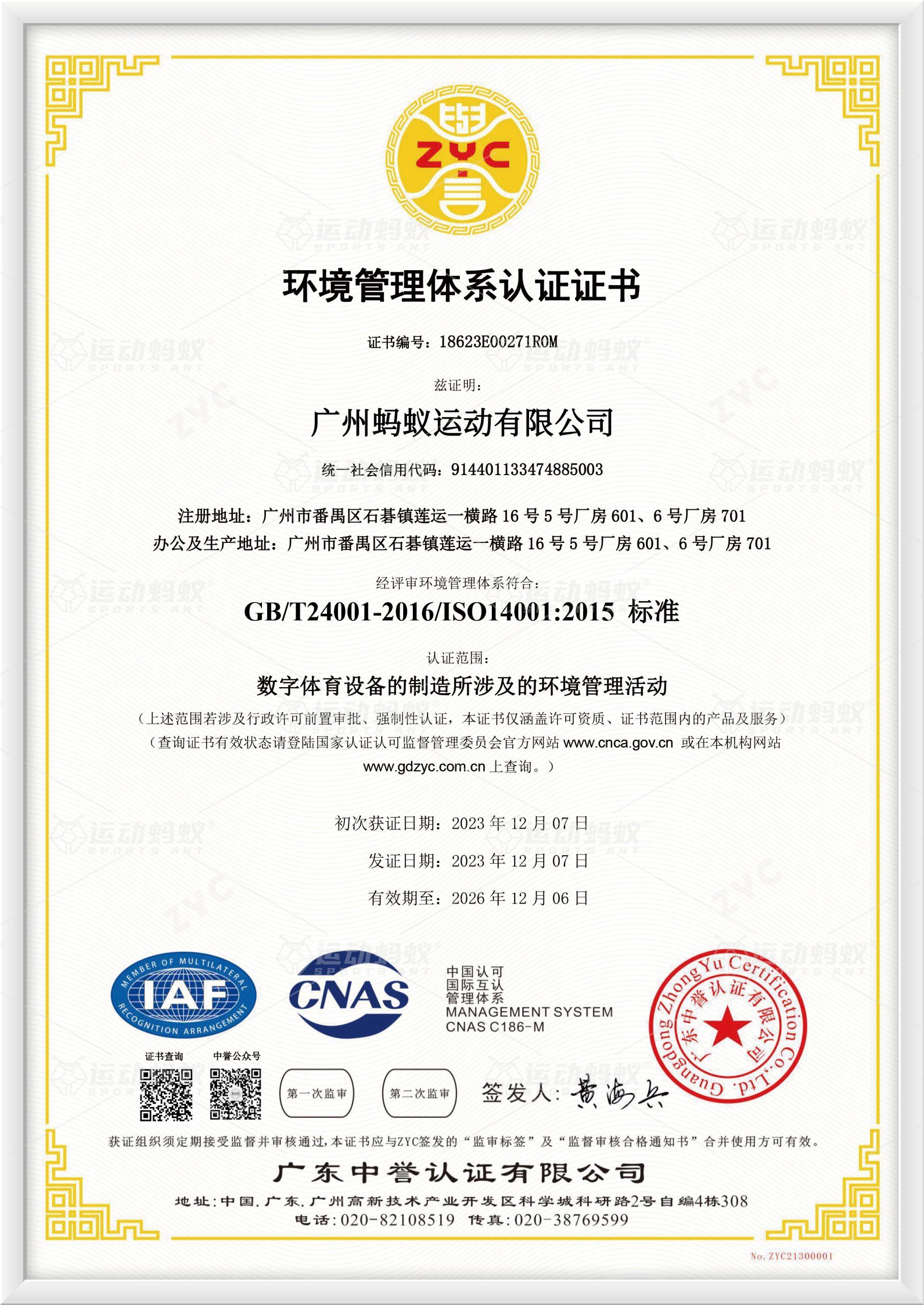 环境管理体系认证证书