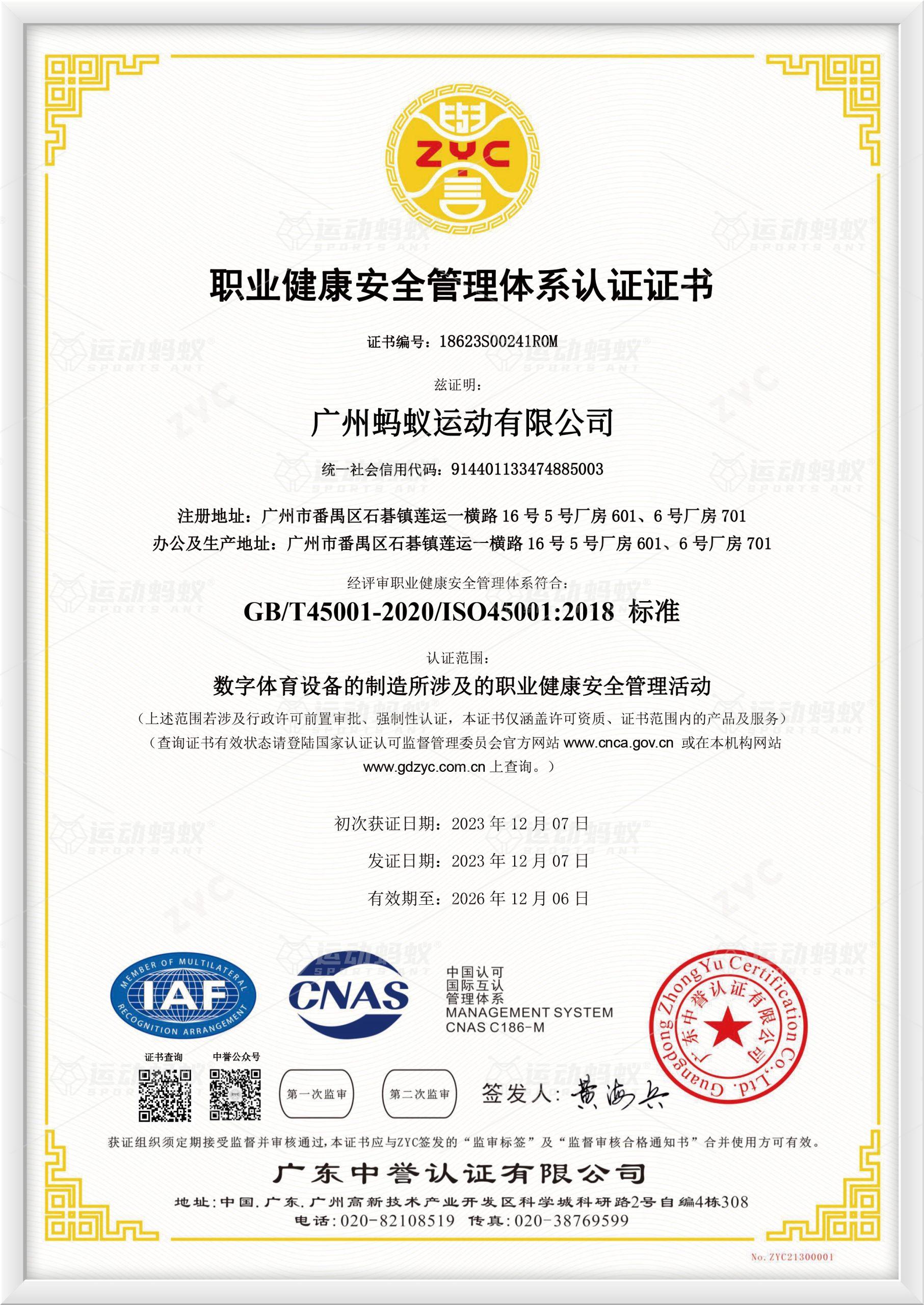 职业健康安全管理体系认证证书