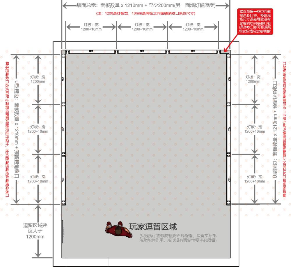 游戏灯套板:所有灯套板不管是什么样的布局方式,都是连续不间断的拼装,灯板最上方的400mm高的面板是可拆卸的检修板,驱动波点灯的供电设备在检修板内部,每块灯板则需要一个电源盒供电,所以检修板内部需要单独供220v电(建议在第一套灯板检修板内部位置留一个供电插座,其他灯板的电可回到此处取电(电源盒之间手牵手取电)。
