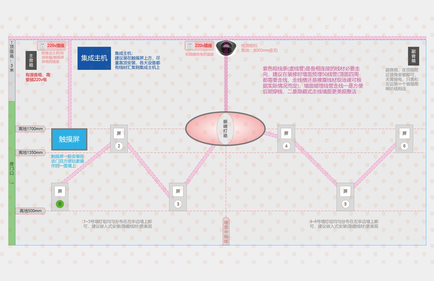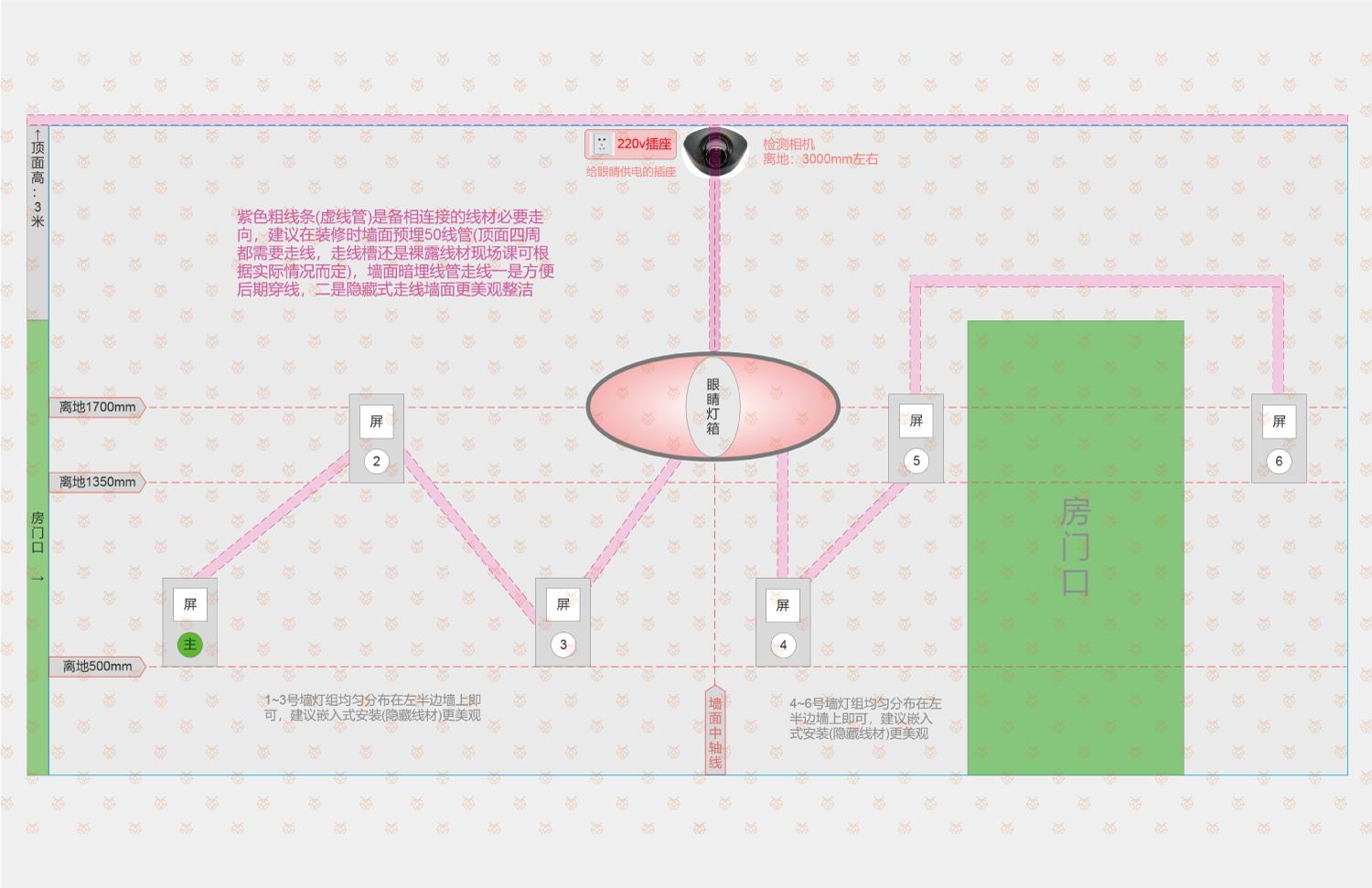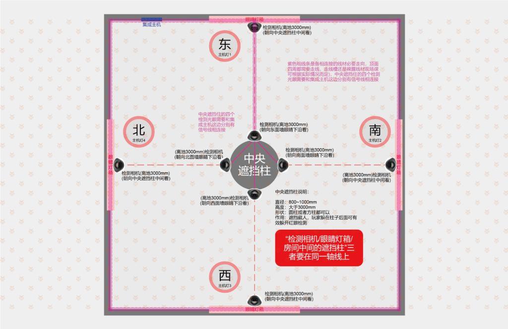 南/西北面墙,各自只需要安装:6组墙灯+一个眼睛+一个检测相机,安装方法和要求和东面墙一样,如遇门洞,可适当调整墙灯位置,但眼睛依然要装在墙面居中线(“检测相机/眼睛灯箱/房间中间的遮挡柱”三者要在同一轴线上)。
