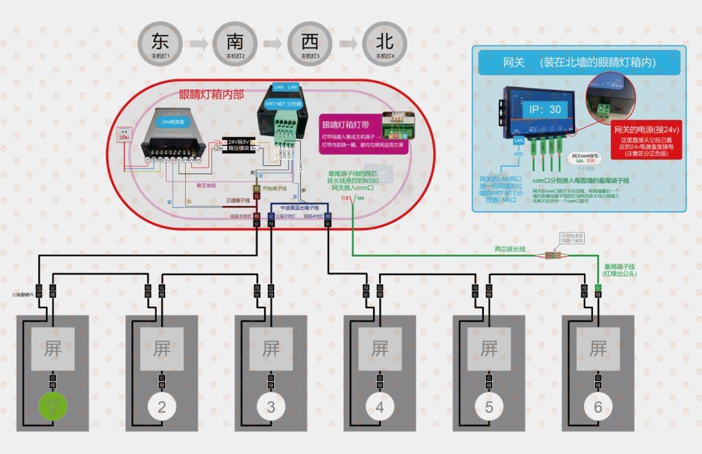 一个房间四面墙,先找好最适合安装触摸屏和集成主机的一面墙定义为“东”面墙,然后就可以按顺时针顺序得出其他“南/西/北”三面墙每一面墙安装: 1只眼睛 + 6组墙灯(标配);安装时注意根据主机灯标签找准对应主机灯,其他2~6号墙灯无标签,可任意混用。