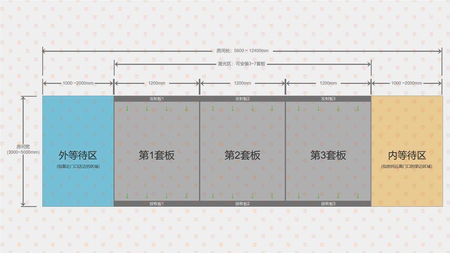 把房间划分为三大区域,靠近门口这边的区域指定为“外等待区”,房间中间区域安装激光套板则为“激光区”,房间最里面划分为“内等待区”。