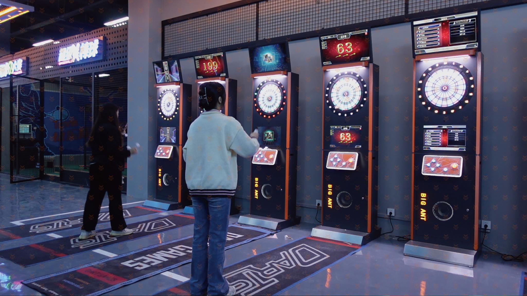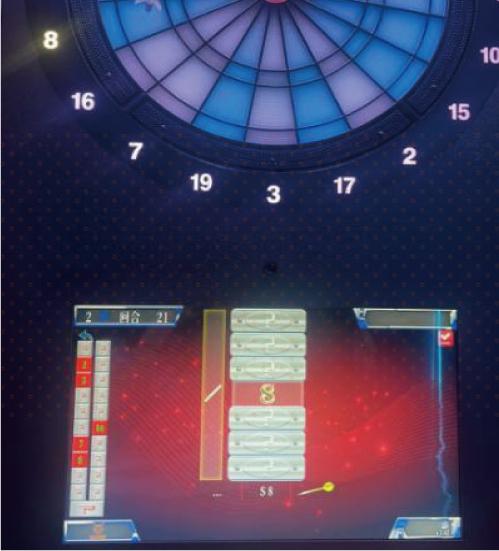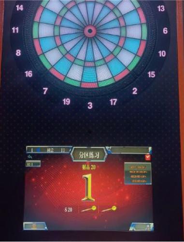2、梅花赛:第一轮按顺序击打7-13分区,击中得射击数字相应分数,三镖后进入下一数字回合;第二轮转盘最外围为D区,D3则击打数字3,三镖都中打出“FULL-A”增加得分100。