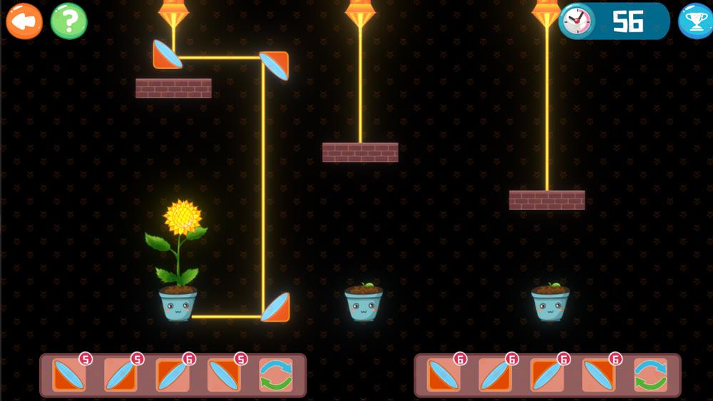 利用物理学的光线反射原理来作战,游戏中我们要将镜子放置到合适的位置,通过镜子的反射来改变激光的方向,点亮关卡中的所有植物,植物生成起来就过关。