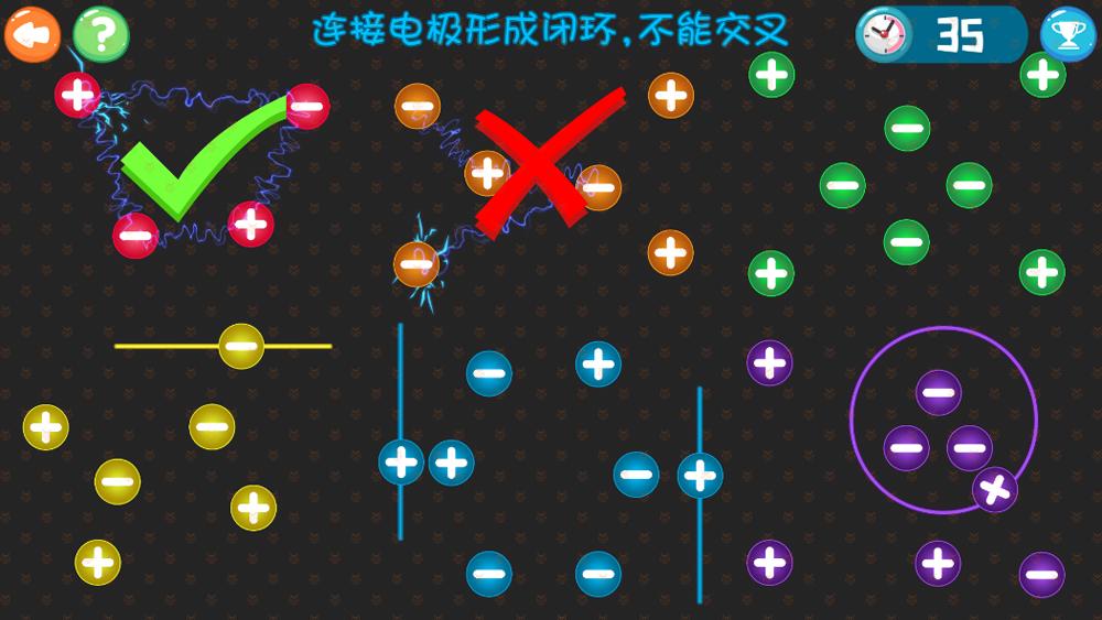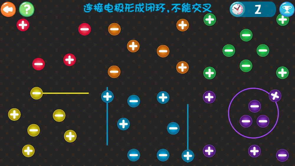 把相同颜色的电极,正负相连全部连接起来形成一个闭合的环,电流不能交叉,全部连接成功即胜利。如果交叉或者连接错误会报错,重新开始连接。