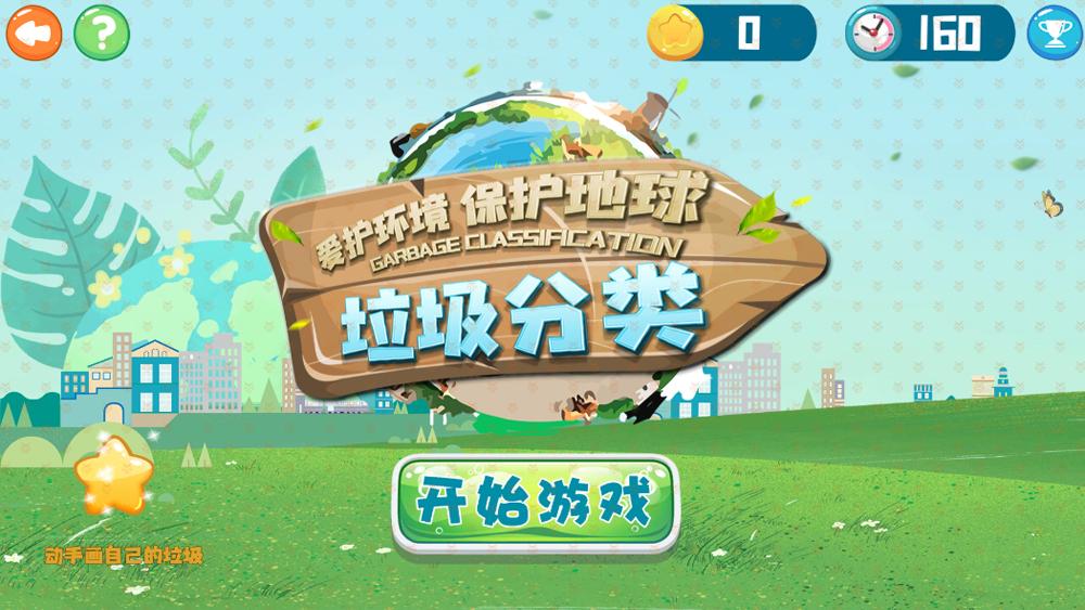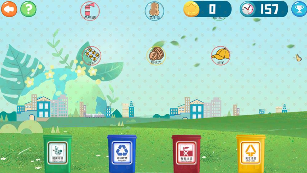 垃圾分为:厨余垃圾,可回收物,有害垃圾,干垃圾。小朋友要将游戏界面上空掉落的垃圾拖进对应分类的垃圾桶即可得分。a.垃圾投放正确加3分。b.垃圾投放错误扣1分。小朋友也可以画自己的垃圾。