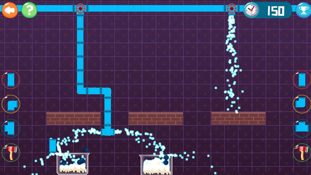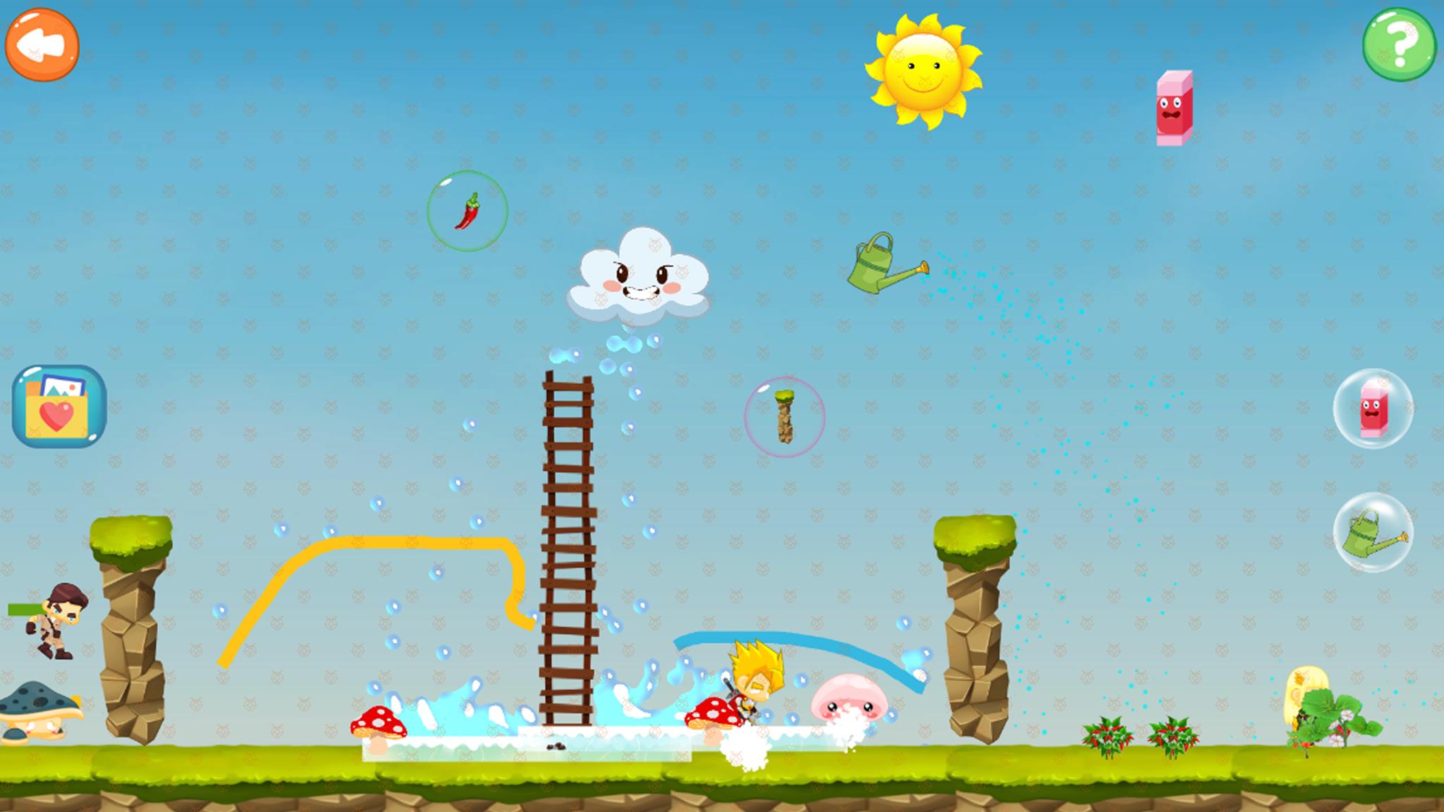 顶上有两处水管阀门出水口,使用泡泡里面的水管工具,可以引导水流的方向去灭火。点击泡泡可以生成一根水管,长按可以拖动水管,拖动后单击可以改变水管的方向。