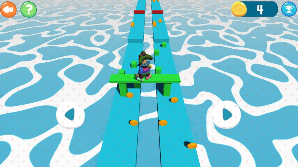 小朋友可以通过左右两个按钮,控制小丑在轨道上左右平移。注意当碰到高坡和墙壁的阻挡的时候,小丑平衡木下面的绿色积木就会减少一个。采集轨道上的绿色积木,小丑的平衡木的高度就会增加。当小丑平衡木左右两边的绿色积木等于0或者高度差大于3,游戏失败。