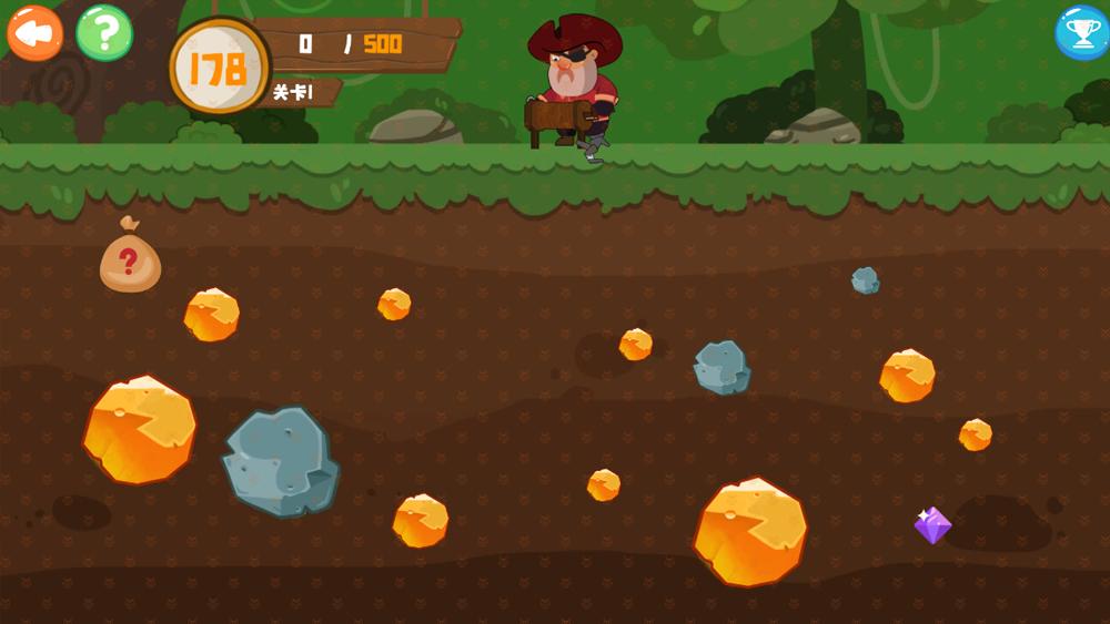 小朋友点击屏幕任意位置,海盗船长就会向这个反向发射一个钩子。当钩子碰到黄金和钻石的时候,海盗船长开心的将黄金拉回来。当钩子碰到石头的时候,海盗船长很不开心的拉回石头。当分数达到过关的时候,进入下一关继续挖取黄金。这个游戏可以锻炼小朋友对运动轨迹的预估能力。