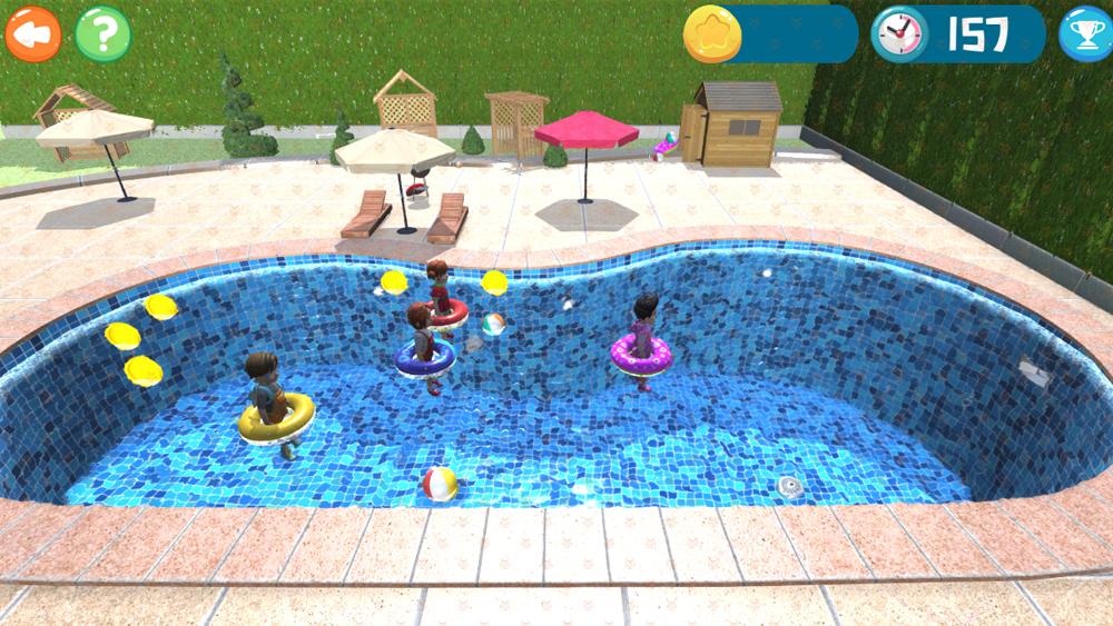 游戏中会散落着许多金币,孩子们需要操控小女孩和小男孩接触这些金币来收集它们。金币可以随机分布在泳池中的各个位置。