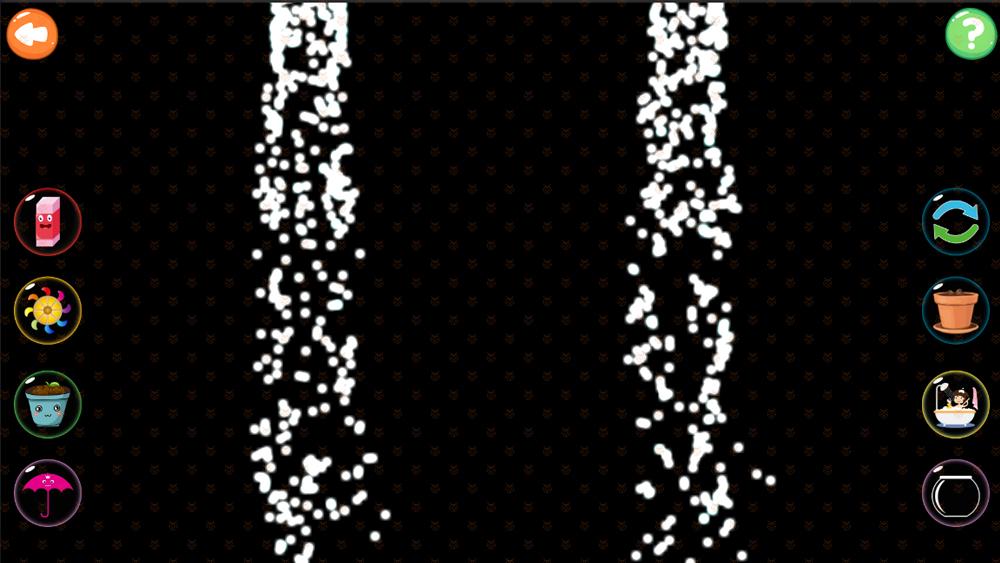 有从天而降的水流,可以在屏幕的任何一个地方开始画方块,支持多人同时操作,方块的颜色按照红黄蓝绿紫顺序出现。水流会沿着方块的路径流淌。引水浇花,花朵会发芽,开花。水流会驱动水车旋转。总共有6款工具去引导水流产生多样的互动效果。