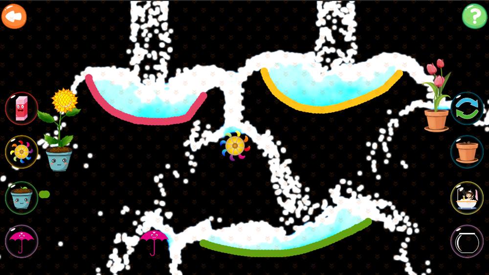 有从天而降的水流,可以在屏幕的任何一个地方开始画线,支持多人同时操作,线的颜色按照红黄蓝绿紫顺序出现。水流会沿着线条的路径流淌。引水浇花,花朵会发芽,开花。水流会驱动水车旋转。总共有6款工具去引导水流产生多样的互动效果。