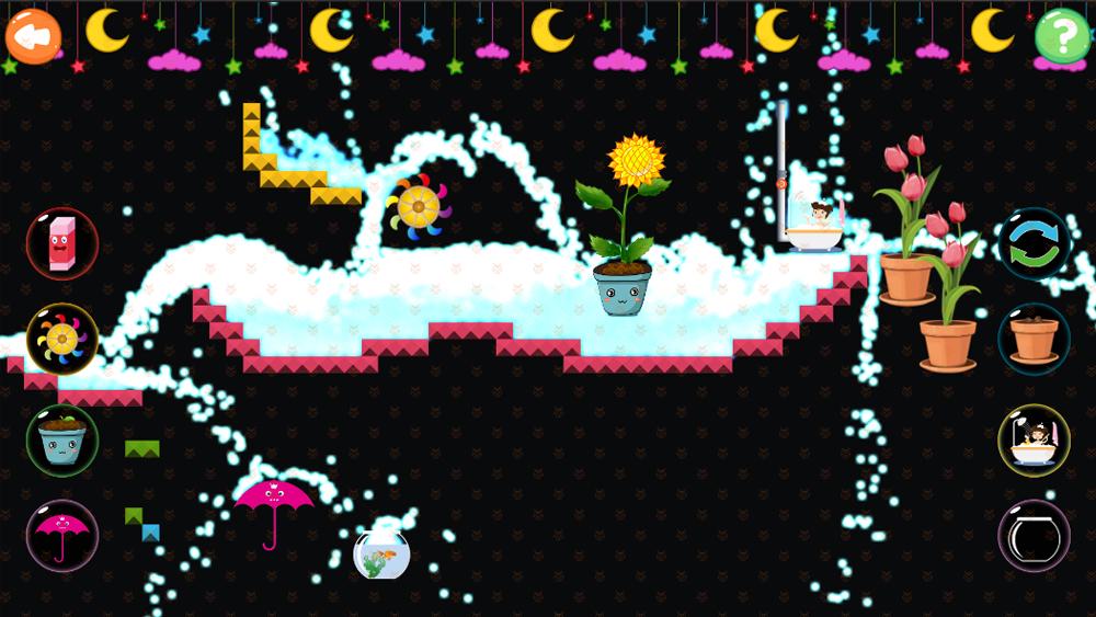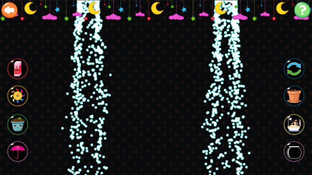 云彩里有从天而降的水流,你可以使用2款工具去引导水流产生多样的互动效果。
