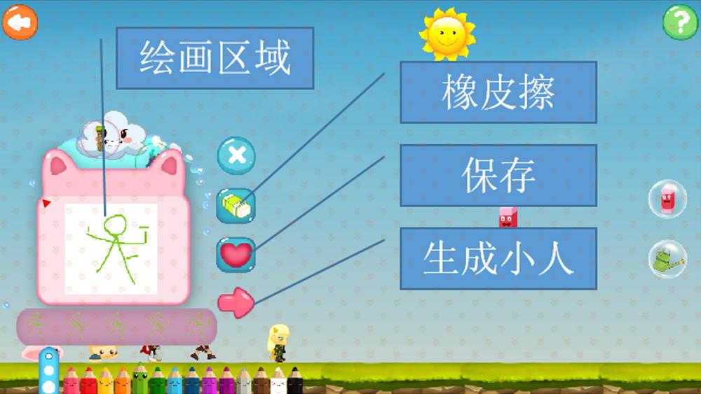 2.可以在绘画区域绘制自己的小人,通过绘制联系的小人,长生小人动画,在场景中所有行为和原生的小人一致。