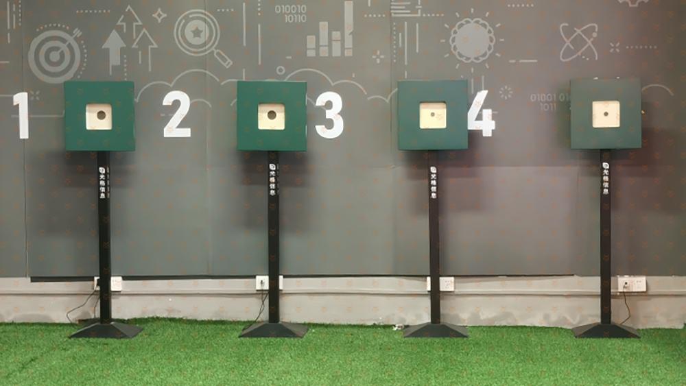 1、轻按光电靶背面开机键,电源灯闪烁表示开机成功,记下接收器背面GG开头的编号。