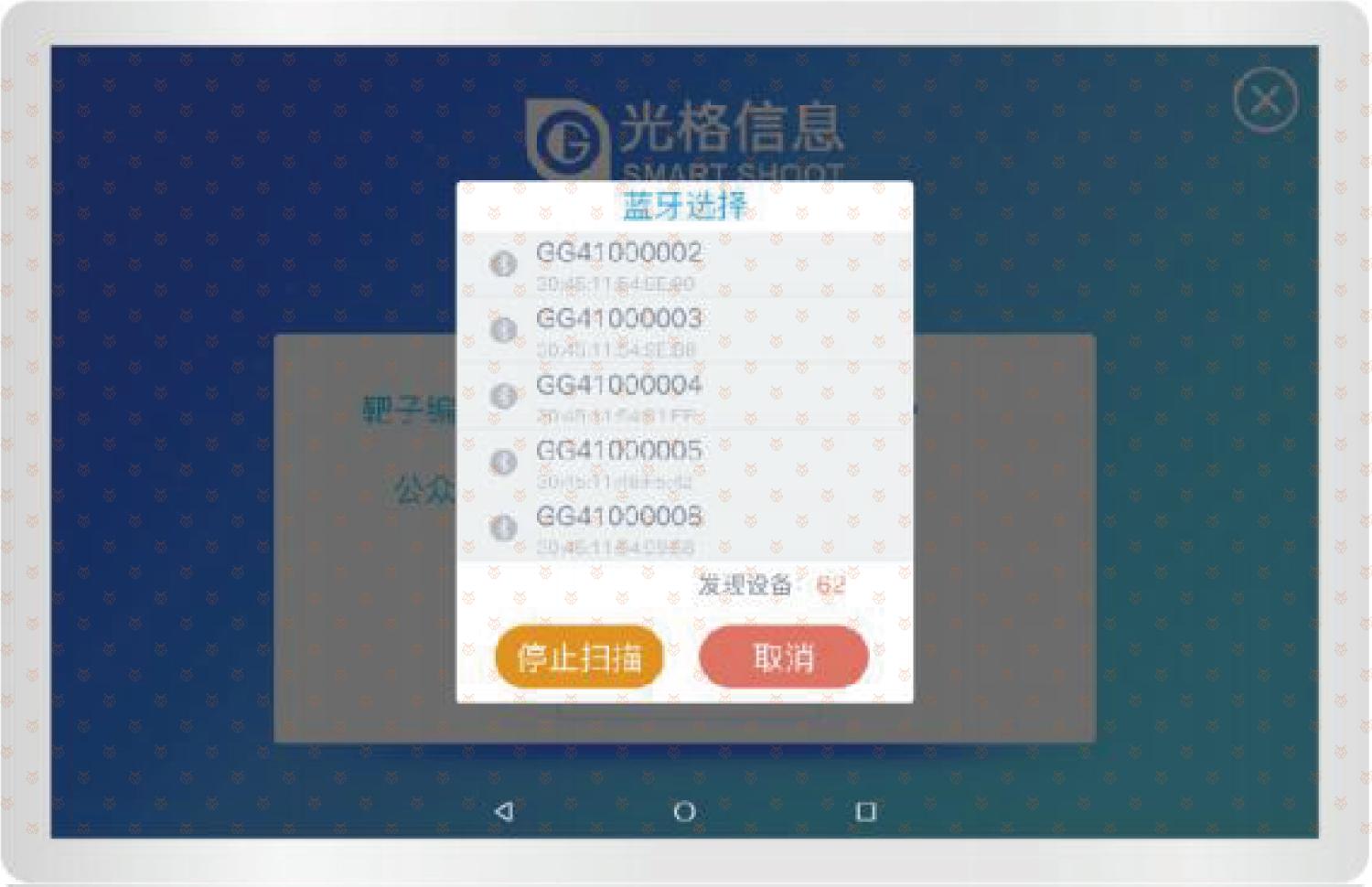 3、首次打开“光电射击”软件需手动添加光电靶,通过蓝牙选择列表选择对应编号的光电靶。日常使用时则默认关联上次使用的光电靶。